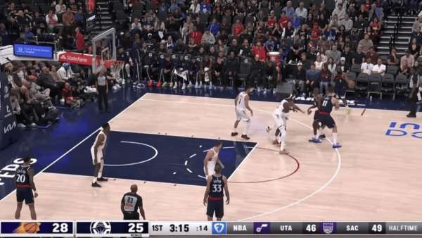 第二节 0:32 已经投出手感的哈登,反击面对布克,直接选择超远三分。