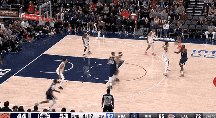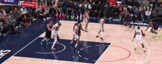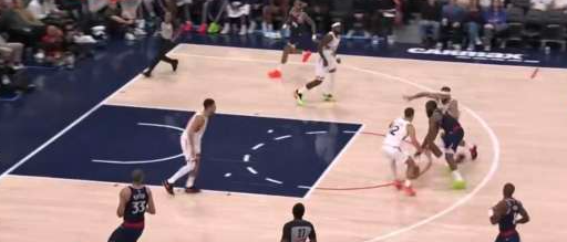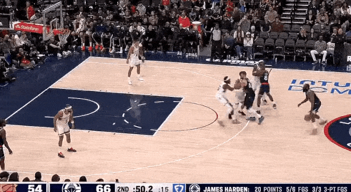 第二节 0:50 哈登借祖巴茨和邓恩高位双掩护,持球干拔三分。