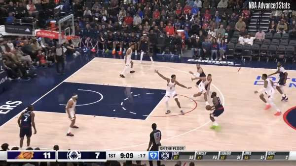 9:11 哈登无球,祖巴茨弧顶持球,琼斯给哈登挡拆,挡住邓恩,哈登绕到左侧接球,祖巴茨顺下,吸引对方防守,哈登三分命中。