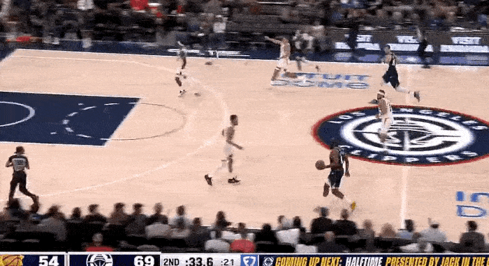 哈登首次得分是 9:36 秒,哈登持球过半场,祖巴茨和琼斯高位双掩护,祖巴茨往禁区跑吸引伊戈达罗防守,琼斯挡住邓恩,哈登直接突破篮下打成 2+1。