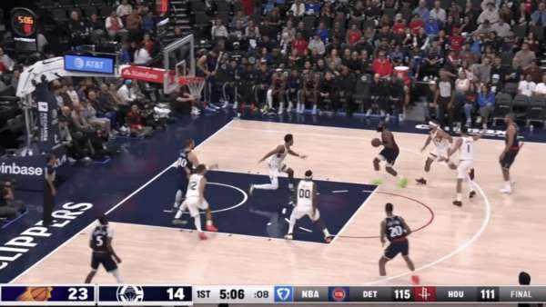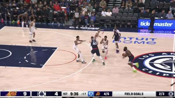 首节 5 分钟,快船落后 9 分,这也是全场太阳的最大领先,已经换上替补的快船开始在哈登带领下追分。