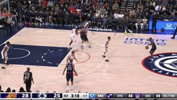 5:09 哈登突破禁区,传到左侧底角埋伏的琼斯,琼斯三分命中。
