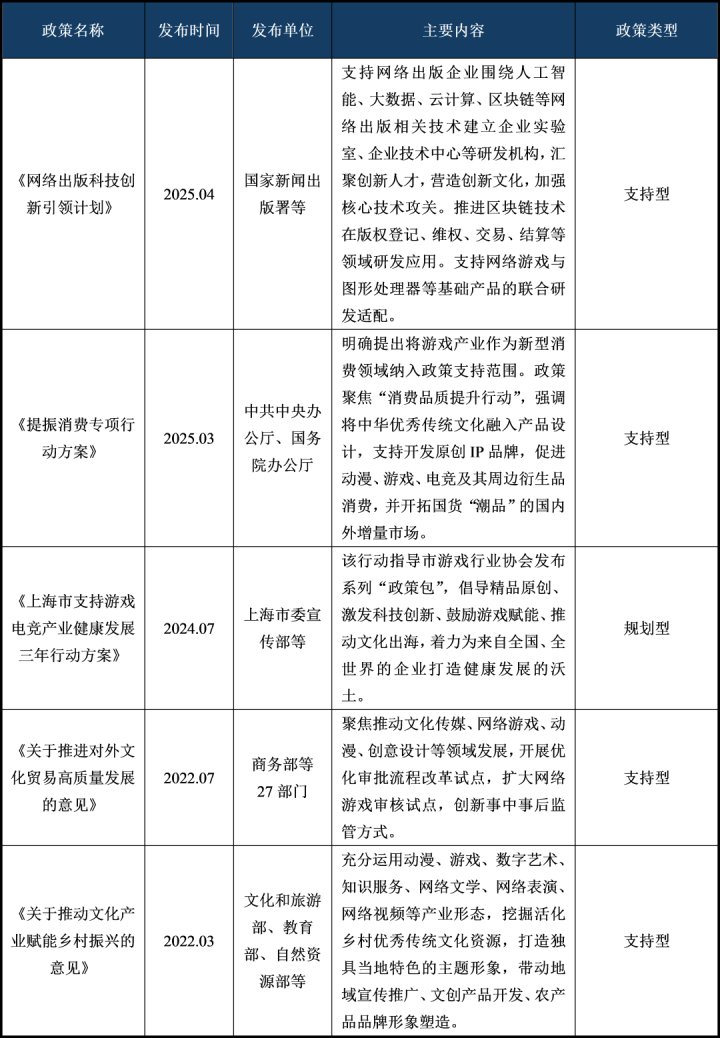 2025年4月,中宣部牵头印发《网络出版科技创新引领计划》,将游戏定位为发展新质生产力、推动文化繁荣、助力科技自立自强的重要力量。中共中央办公厅、国务院办公厅发布《提振消费专项行动方案》,方案明确提出将游戏产业作为新型消费领域纳入政策支持范围。政策聚焦“消费品质提升行动”,强调将中华优秀传统文化融入产品设计,支持开发原创IP品牌,促进动漫、游戏、电竞及其周边衍生品消费,并开拓国货“潮品”的国内外增量市场。上海市制定《上海市支持游戏电竞产业健康发展三年行动方案》,指导市游戏行业协会发布系列“政策包”,倡导精品原创、激发科技创新、鼓励游戏赋能、推动文化出海,着力为来自全国、全世界的企业打造健康发展的沃土。