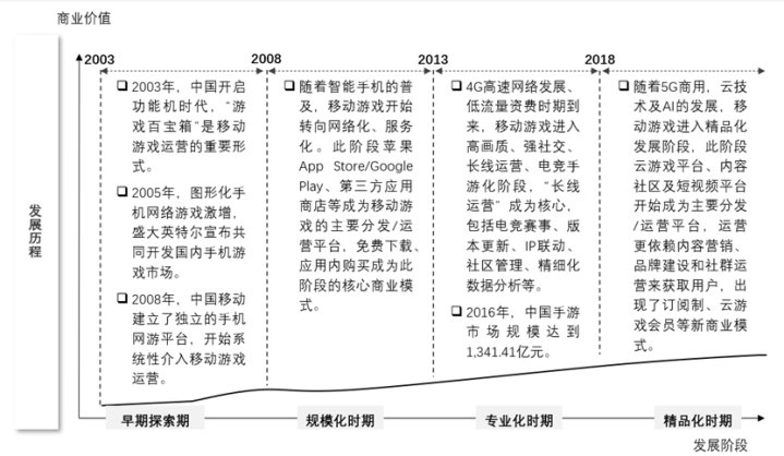 早期探索时期(2003-2008年):此阶段移动游戏以单机游戏为主,运营商“百宝箱”业务为主要分发/运营平台,短信扣费和单次下载付费为此阶段的核心商业模式。2003年,中国开启功能机时代,中国移动建立百宝箱业务,其中游戏百宝箱是重要组成部分;2005年,图形化手机网络游戏激增,盛大英特尔宣布共同开发国内手机游戏市场;2008年,中国移动建立了独立的手机网游平台,并开始系统性介入手机网游的运营。