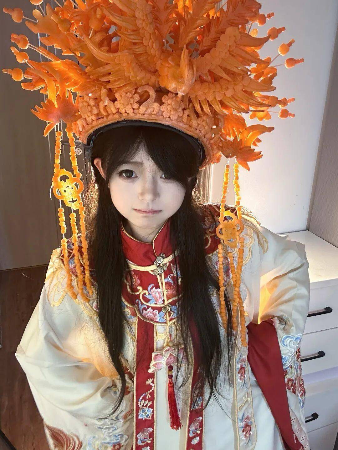 她的创作材料以新鲜生胡萝卜为主。陈琴表示,白萝卜、青萝卜也曾尝试,但食用后易刺激肠胃,而胡萝卜质地软硬适中、颜色鲜亮、便于塑形和保存,因此成为固定原料。创作时,她不提前切割,直接用门牙、犬牙配合啃咬、打磨。精细部位则放慢速度,用牙尖一点点雕琢,全程凭手感和经验把控造型与细节。