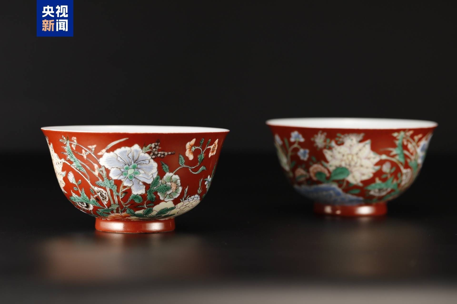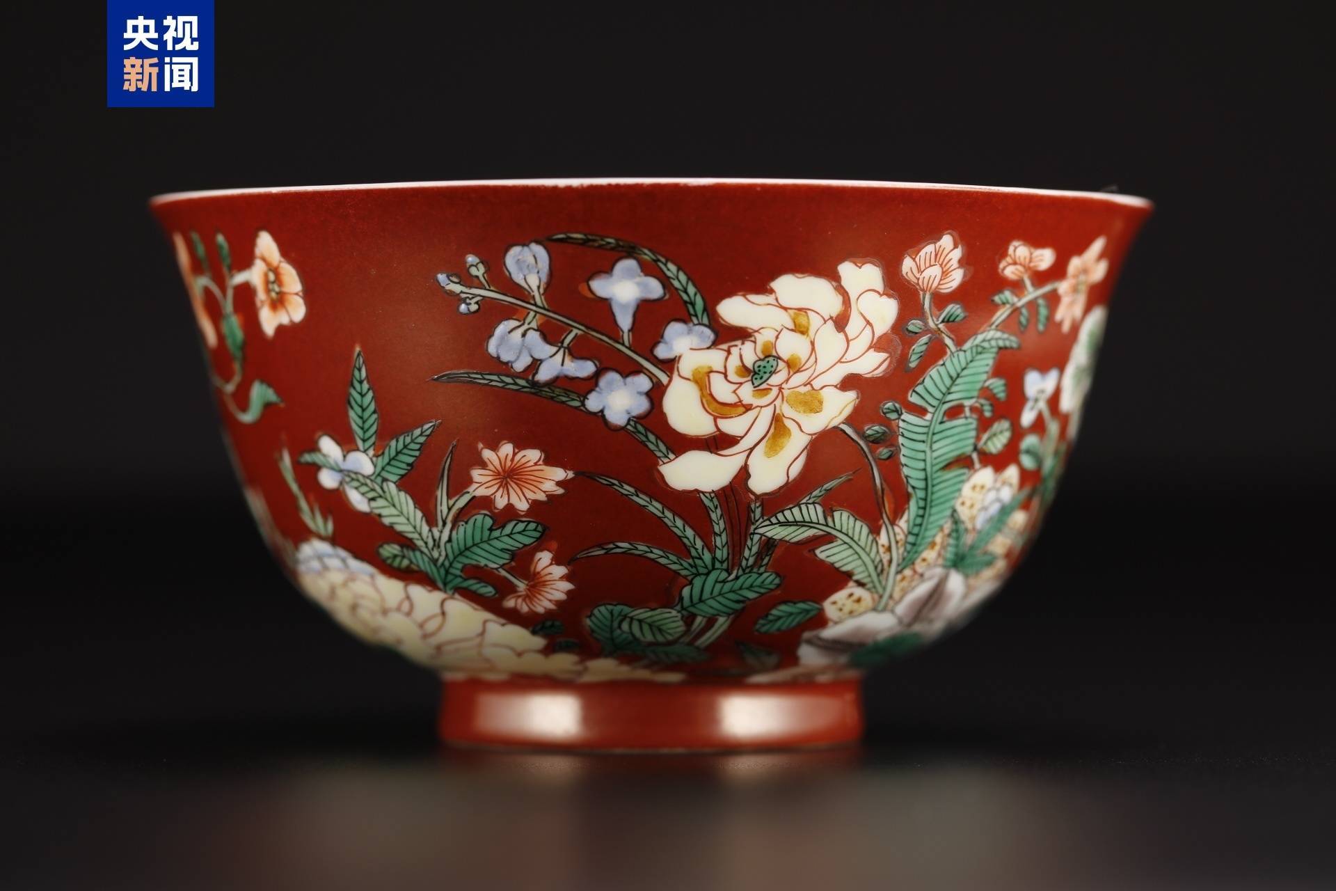 碗身外壁以鲜亮的珊瑚红色为底