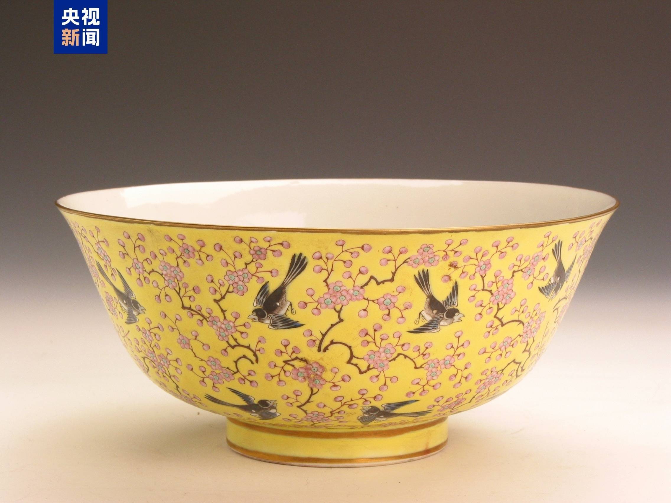 <清同治款粉彩黄地梅鹊纹大碗>