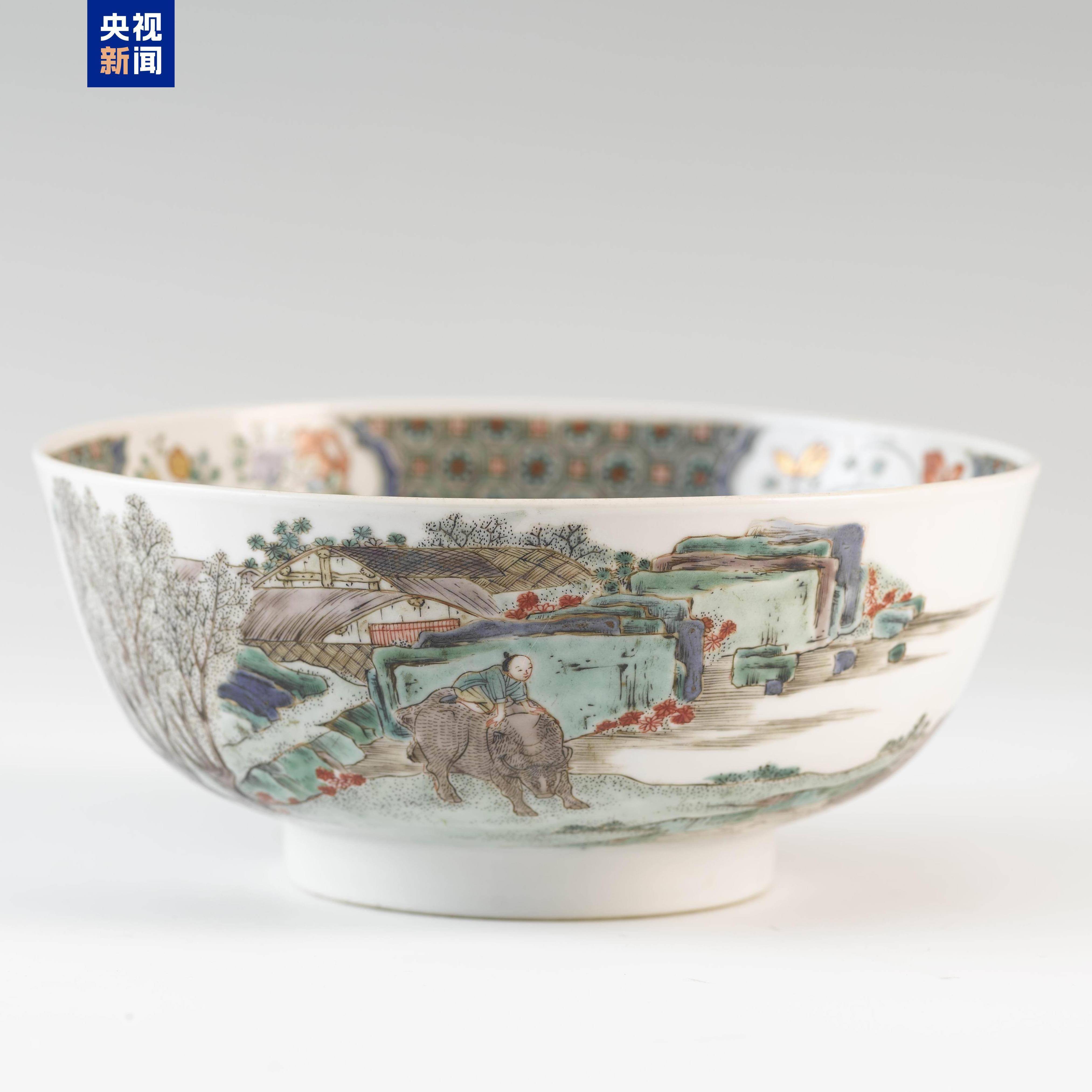 碗上描绘了一幅百姓春耕图景