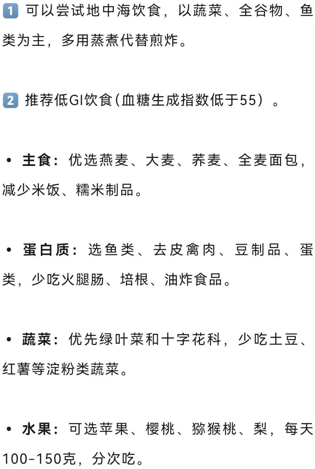 • 饮食建议:控制热量,多吃蔬菜、水果、全谷物,适量优质蛋白,戒烟限酒,不暴饮暴食。